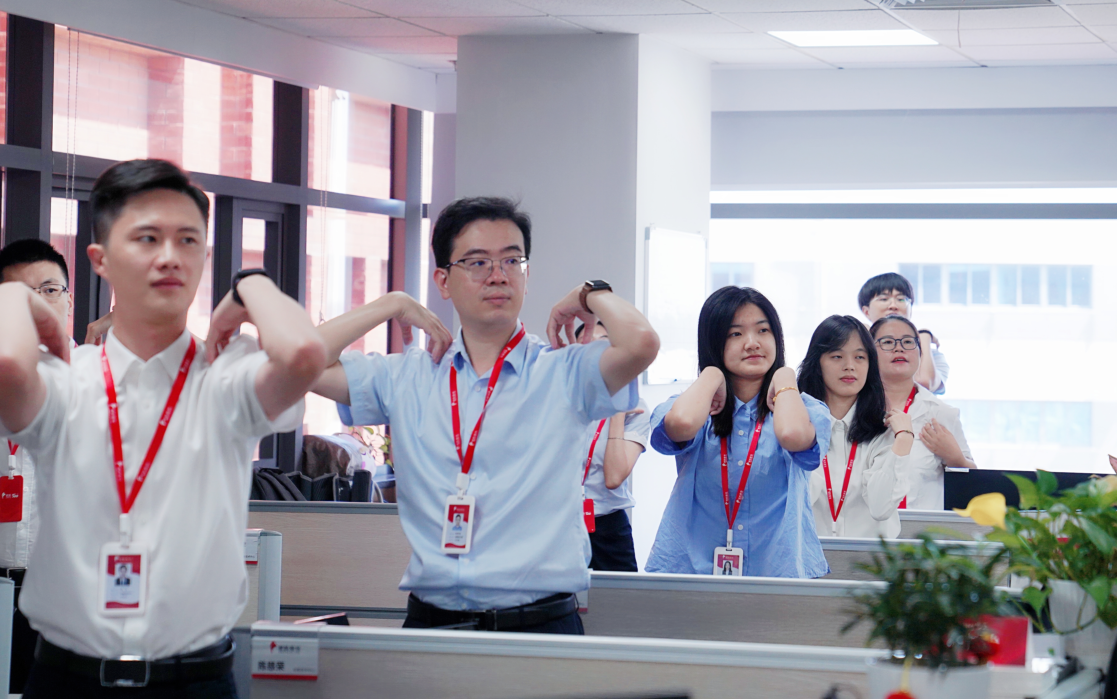 早上十點半,隨著律動音樂的響起,大家紛紛從工位上起身,加入到了活力工間操隊伍中。一二三四,五六七八,二二三四,五六七八……頭部運(yùn)動、體側(cè)運(yùn)動、擴(kuò)胸運(yùn)動、體轉(zhuǎn)運(yùn)動……每一個節(jié)拍,每一個動作,無不體現(xiàn)著象嶼人的朝氣蓬勃和積極向上!